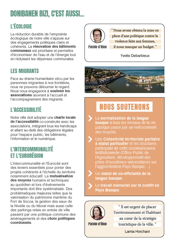 L’intercommunalité et l’Eurocité sont des leviers essentiels pour porter des projets cohérents à l’échelle du territoire notamment éducatif. La mutualisation des moyens humains et techniques au quotidien et lors d’événements importants doit être systématisée. Des problématiques majeures telles que la valorisation du patrimoine maritime du Fort de Socoa, la gestion des eaux de la Nivelle ou du littoral mais aussi celle des parkings relais en entrée de ville passent par une politique commune des aménagements et des choix politiques coordonnés.